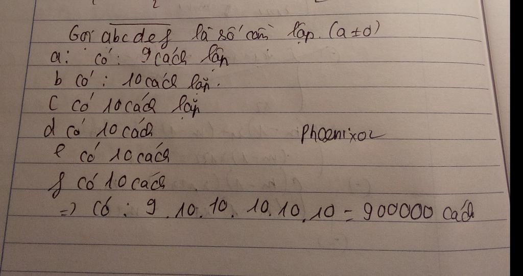 Các số còn lại mỗi số có `10` cách chọn nên ta có `10^5` cách chọn