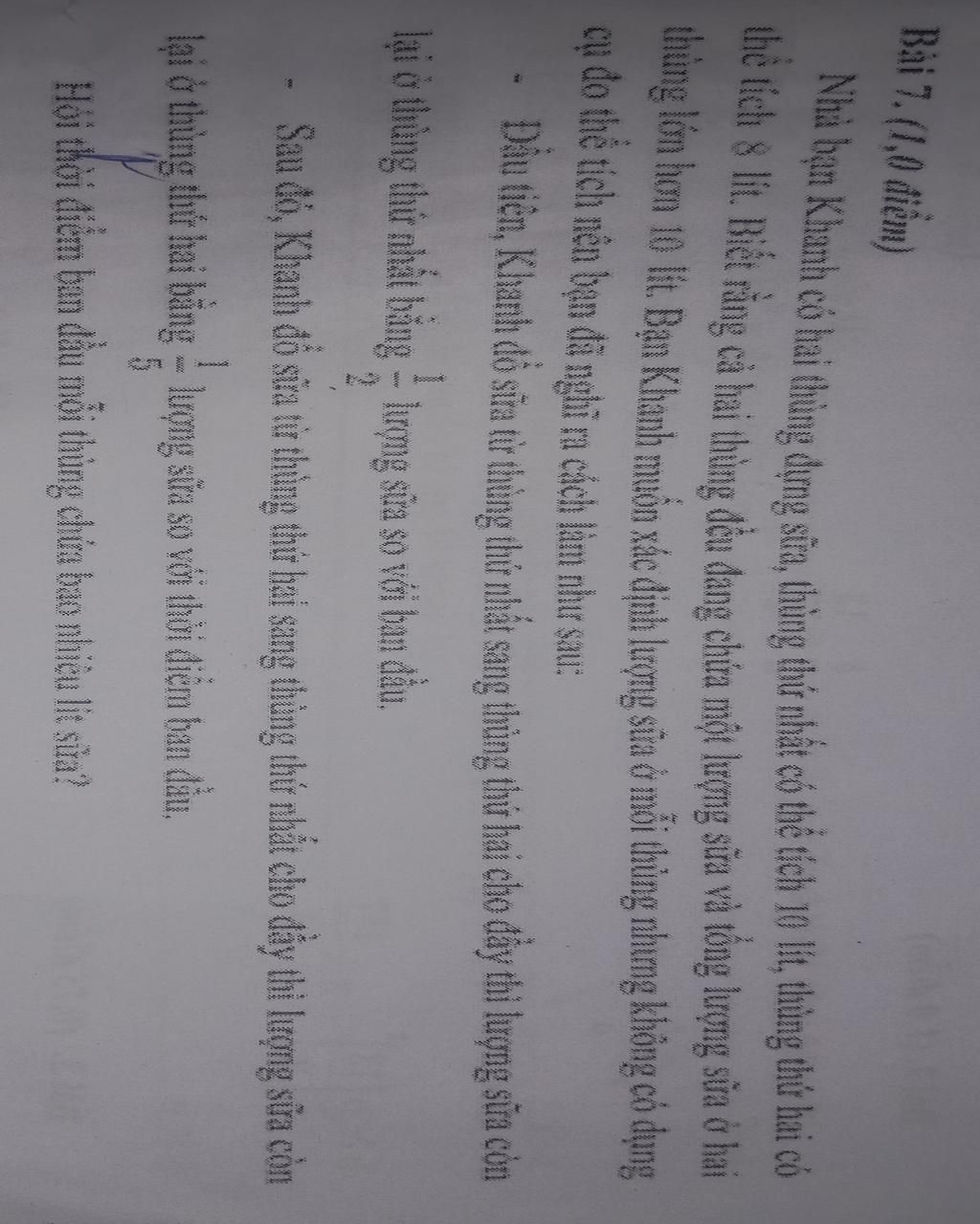 Vậy thời điểm ban đầu thùng thứ nhất chứa `6l` sữa, thùng thứ hai chứa `5l` sữa.
