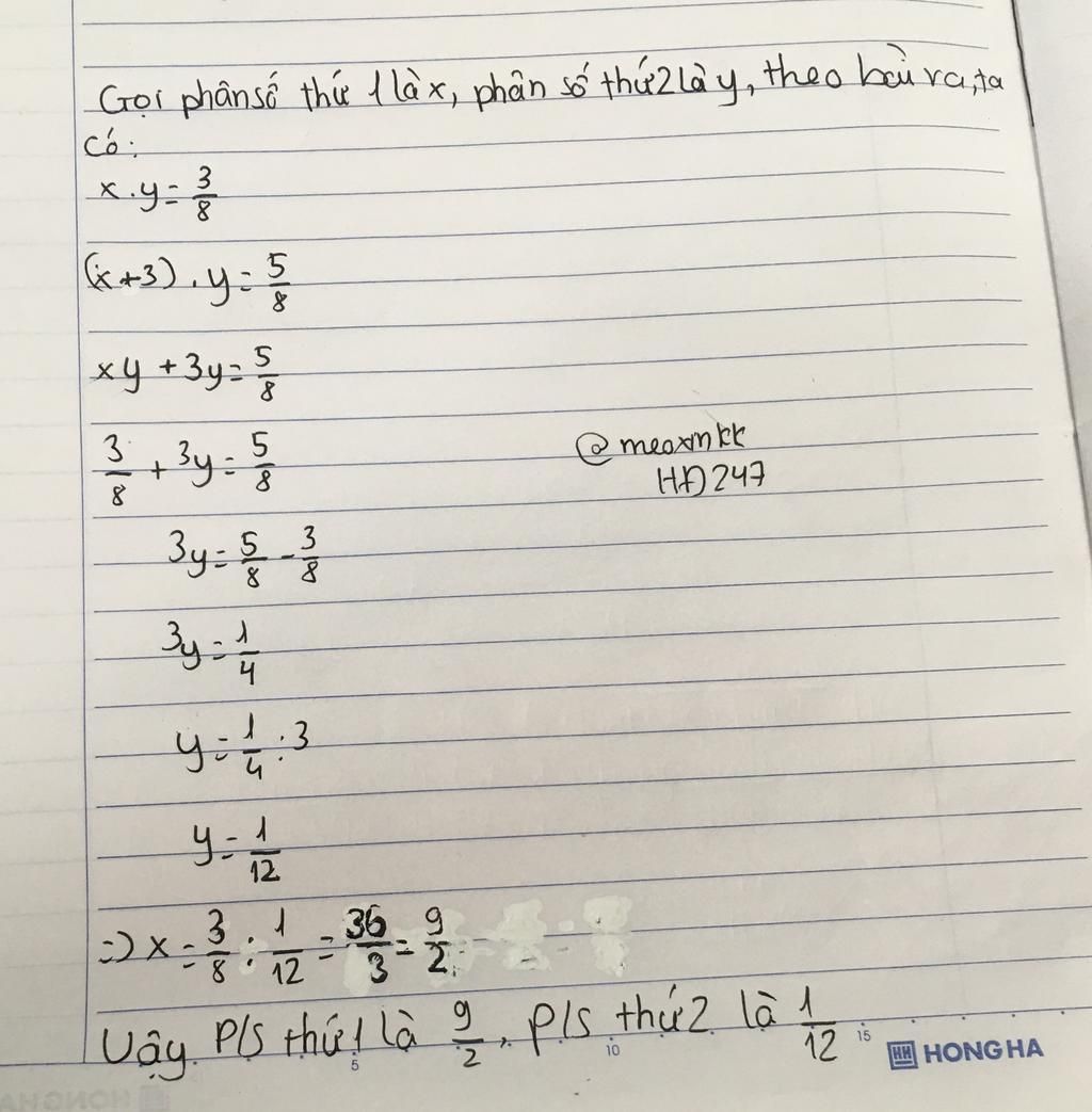 tích của hai phân số là 3/8, nếu thêm 3 đơn vị vào phân số thứ nhất thì tích của hai phân số là 5/8. Tìm hai phân số đó