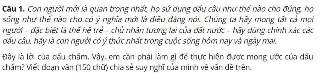 Câu 1. Con người mới là quan trọng nhất, họ sử dụng dấu câu như thế nào cho đúng, họ sống như thế nào cho có ý nghĩa mới là điều đáng nói. Chúng ta hãy mong tất cả mọi người – đặc biệt là thế hệ trẻ – chủ nhân tương lai của đất nước – hãy dùng chính xác các dấu câu, hãy là con người có ý thức nhất trong cuộc sống hôm nay và ngày mai.