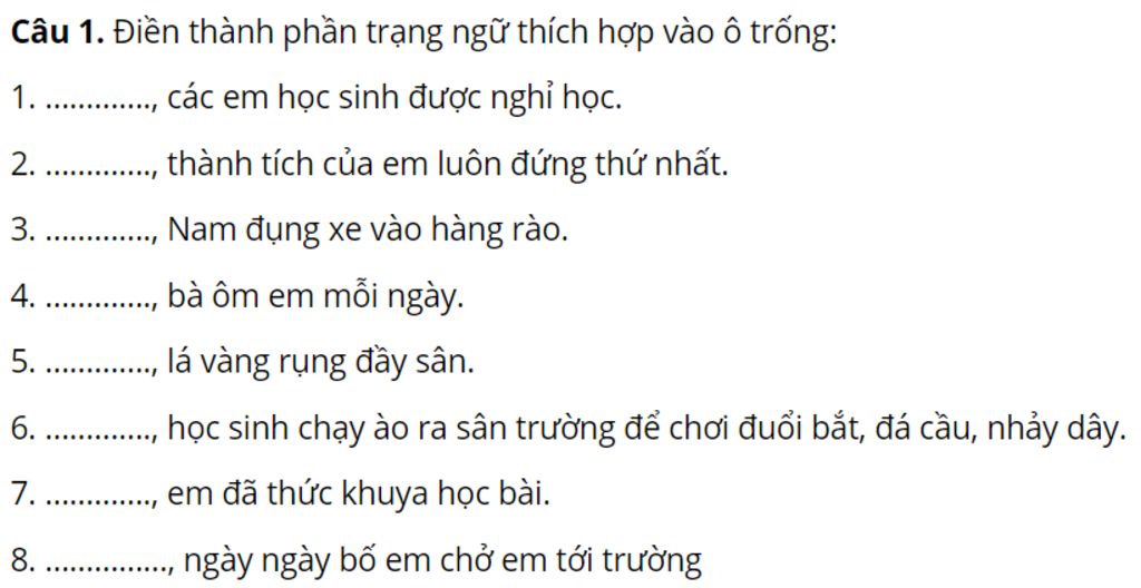 Câu `1`. Điền thành phần trạng ngữ thích hợp vào ô trống :