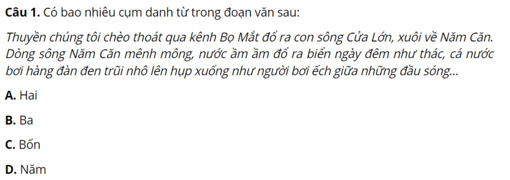 Câu `1`. Có bao nhiêu cụm danh từ trong đoạn văn sau:
