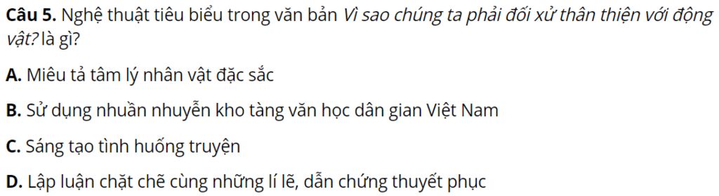 `5)` Nghệ thuật tiêu biểu trong văn bản ''Vì sao chúng ta phải đối xử thân thiện với động vật'' là: