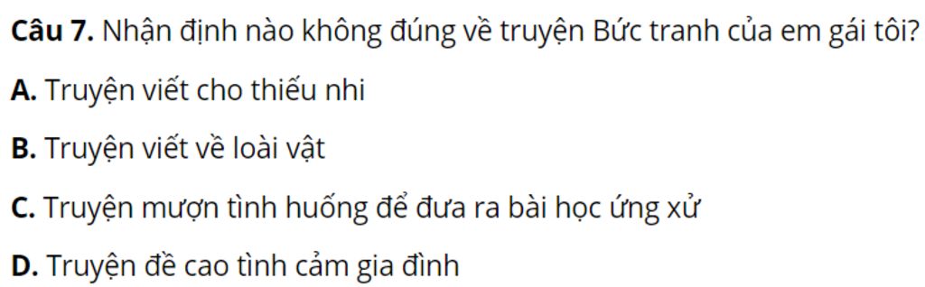 Câu `7`. Nhận định nào không đúng về truyện Bức tranh của em gái tôi?