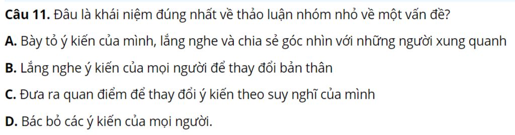 Câu `11`. Đâu là khái niệm đúng nhất về thảo luận nhóm nhỏ về một vấn đề?