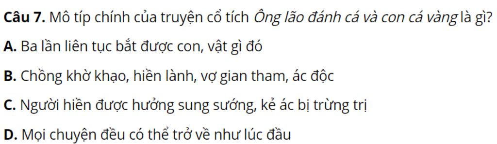 `-`Mô tip chính của truyện cổ tích Ông lão đánh cá và con cá vàng là chồng khờ khạo, hiền lành, vợ gian tham, ác độc
