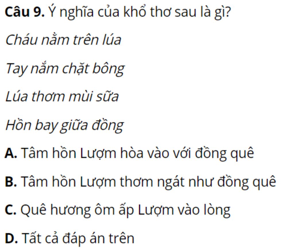 `@` Ý nghĩa của khổ thơ trên là tâm hồn Lượm hòa vào với đồng quê, tâm hồn Lượm thơm ngát như đồng quê, quê hương ôm ấp Lượm vào lòng