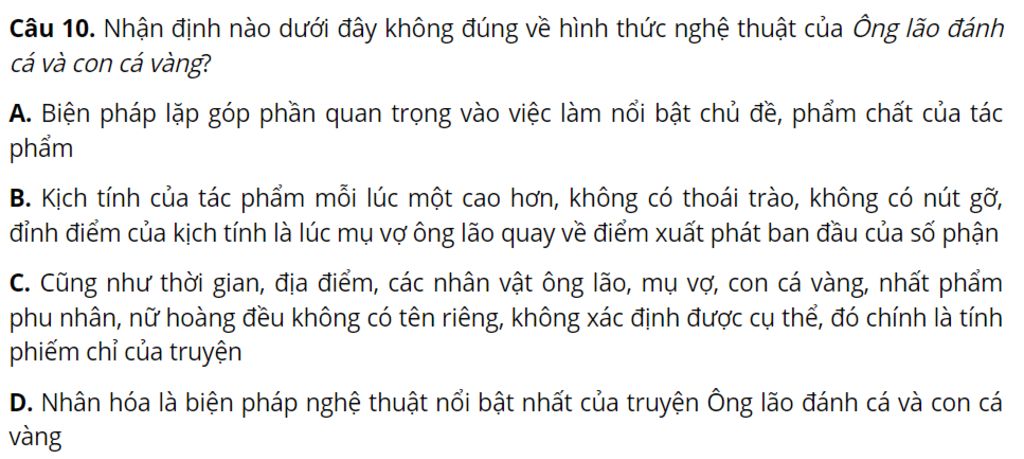 `-` Nhân hóa là biện pháp nghệ thuật nổi bật nhất của truyện Ông lão đánh cá và con cá vàng là nhận định không đúng. Vì biện pháp lặp góp phần quan trọng vào việc làm nổi bật chủ đề, phẩm chất của tác phẩm