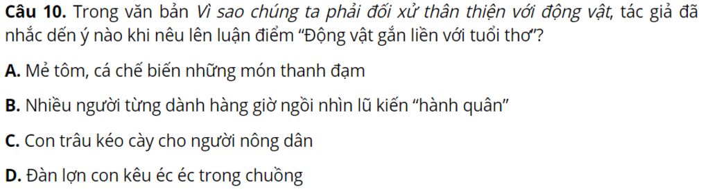Câu 10. Trong văn bản Vì sao chúng ta phải đối xử thân thiện với động vật, tác giả đã nhắc dến ý nào khi nêu lên luận điểm “Động vật gắn liền với tuổi thơ”?