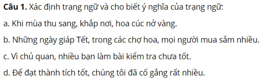 Câu `1` : Xác định trạng ngữ và cho biết ý nghĩa của trạng ngữ :