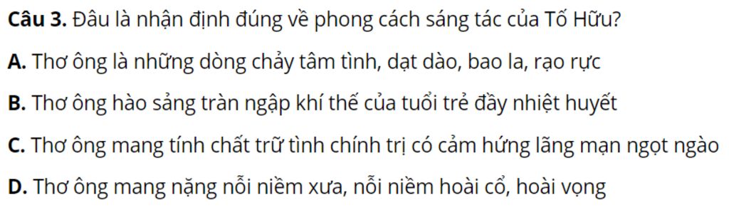 `@` Thơ của Tố Hữu mang tính chất trữ tình chính trị có cảm hứng lãng mạn ngọt ngào. Thơ Tố Hữu mang khuynh hướng sử thi và cảm hứng lãng mạn, thơ chủ yếu quan tâm đến những vấn đề sống còn của đất nước và là nguồn cảm hứng lịch sử dân tộc.