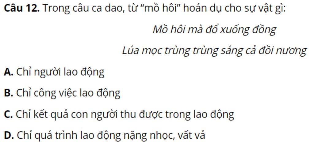Câu 12. Trong câu ca dao, từ “mồ hôi” hoán dụ cho sự vật gì: Mồ hôi mà đổ xuống đồng Lúa mọc trùng trùng sáng cả đồi nương