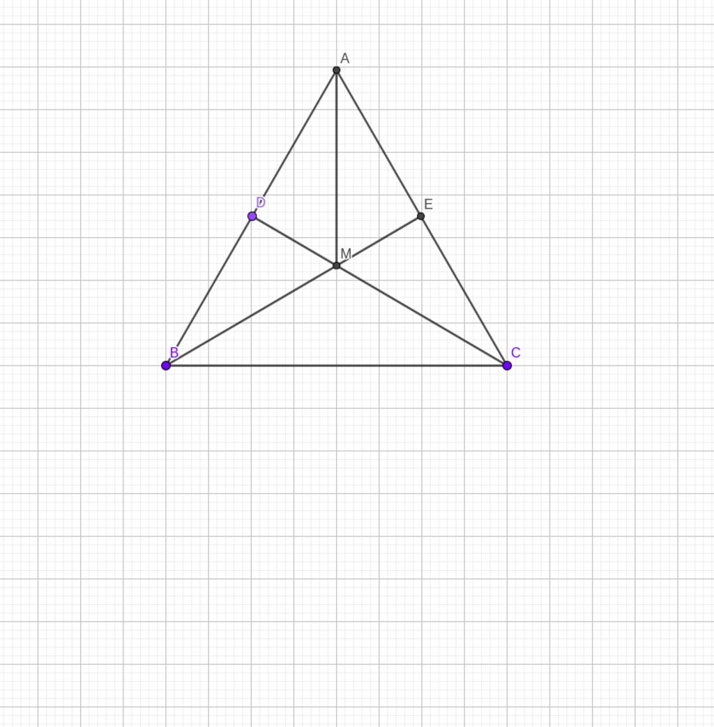 Cho tam giác ABC cân tại A , trênh cạnh AB lấy điểm D , trênh cạnh AC lấy điểm E sao cho AD=AE. Gọi M là giao điểm cua BE và CD . Chứng minh ;