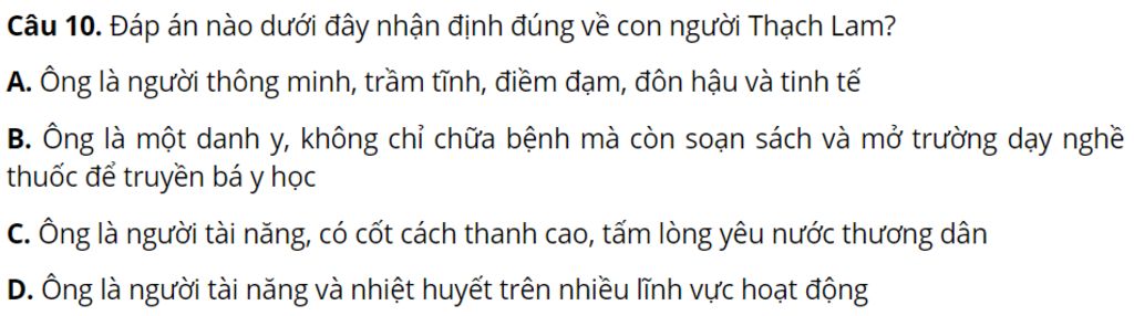 Câu `10`. Đáp án nào dưới đây nhận định đúng về con người Thạch Lam?