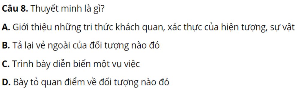 `@` Thuyết minh là giới thiệu những tri thức khách quan, xác thực của hiện tượng, sự vật