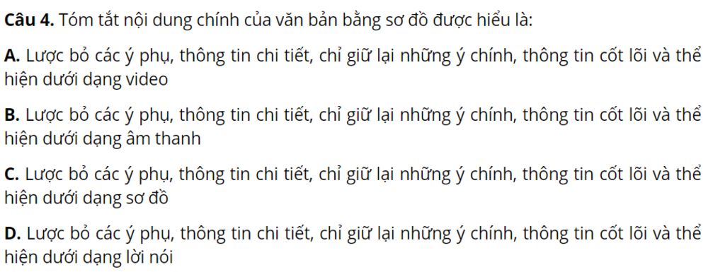 Câu `4` : Tóm tắt nội dung chính của văn bản bằng sơ đồ được hiểu là:
