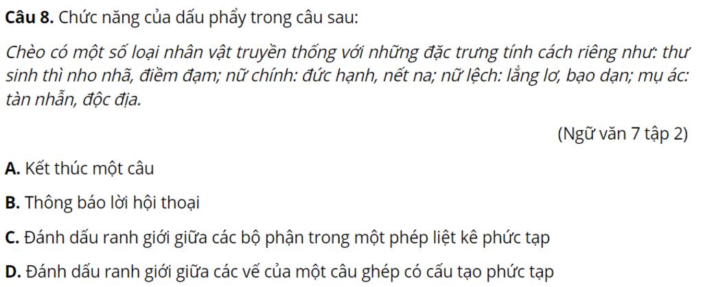 Câu 8. Chức năng của dấu phẩy trong câu sau: Chèo có một số loại nhân vật truyền thống với những đặc trưng tính cách riêng như: thư sinh thì nho nhã, điềm đạm; nữ chính: đức hạnh, nết na; nữ lệch: lẳng lơ, bạo dạn; mụ ác: tàn nhẫn, độc địa. (Ngữ văn 7 tập 2)