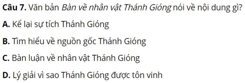Đáp án: `C.` Bàn luận về nhân vật Thánh Gióng