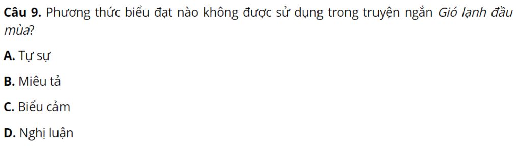 `-` Các phương thức biểu đạt được sử dụng trong truyện ngắn ''Gió lạnh đầu mùa'': Tự sự, miêu tả, biểu cảm.