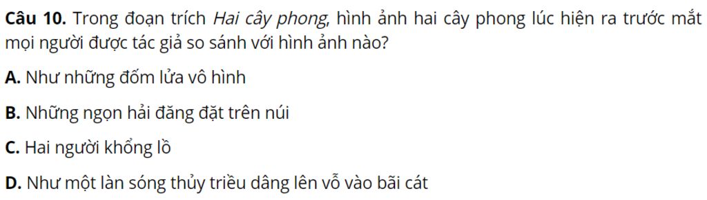 Câu `10`. Trong đoạn trích Hai cây phong, hình ảnh hai cây phong lúc hiện ra trước mắt mọi người được tác giả so sánh với hình ảnh nào?