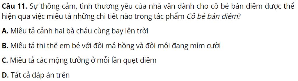 Câu `11`. Sự thông cảm, tình thương yêu của nhà văn dành cho cô bé bán diêm được thể hiện qua việc miêu tả những chi tiết nào trong tác phẩm Cô bé bán diêm?