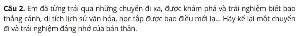 Câu 2. Em đã từng trải qua những chuyến đi xa, được khám phá và trải nghiệm biết bao thắng cảnh, di tích lịch sử văn hóa, học tập được bao điều mới lạ… Hãy kể lại một chuyến đi và trải nghiệm đáng nhớ của bản thân