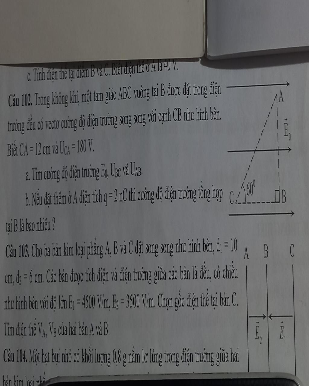 \({E_1} = k.\dfrac{q}{{A{B^2}}} = \dfrac{{{{9.10}^9}{{.2.10}^{ - 9}}}}{{0,{{12}^2} - 0,{{06}^2}}} = \dfrac{{5000}}{3}\left( {V/m} \right)\)