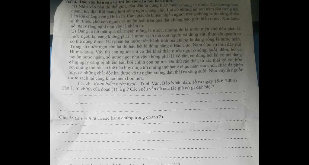 Câu 1: Ý chính trong đoạn văn là nói về vấn đề thiếu nước trên thế giới.