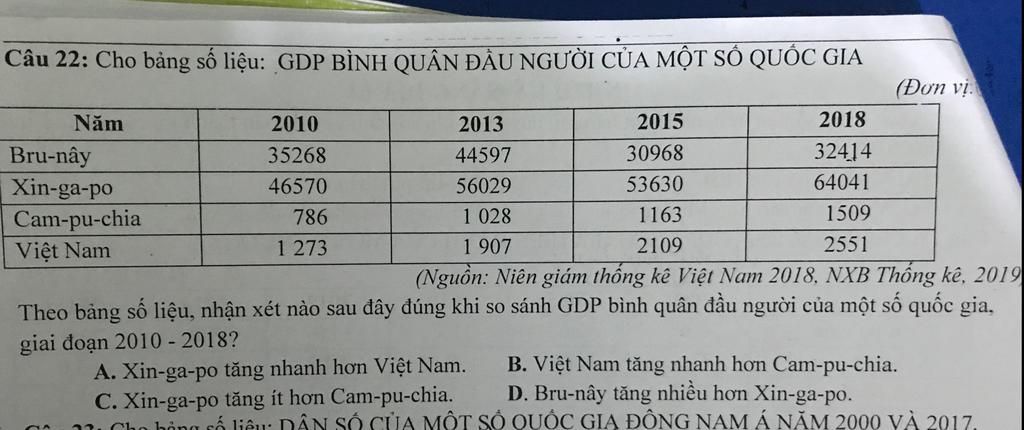 `=>` Vì `GDP` của Bru`-`nây có xu hướng giảm nên không thể tăng nhiều hơn `GDP` của Xin`-`ga`-`po được `=>` Loại đáp án `D`