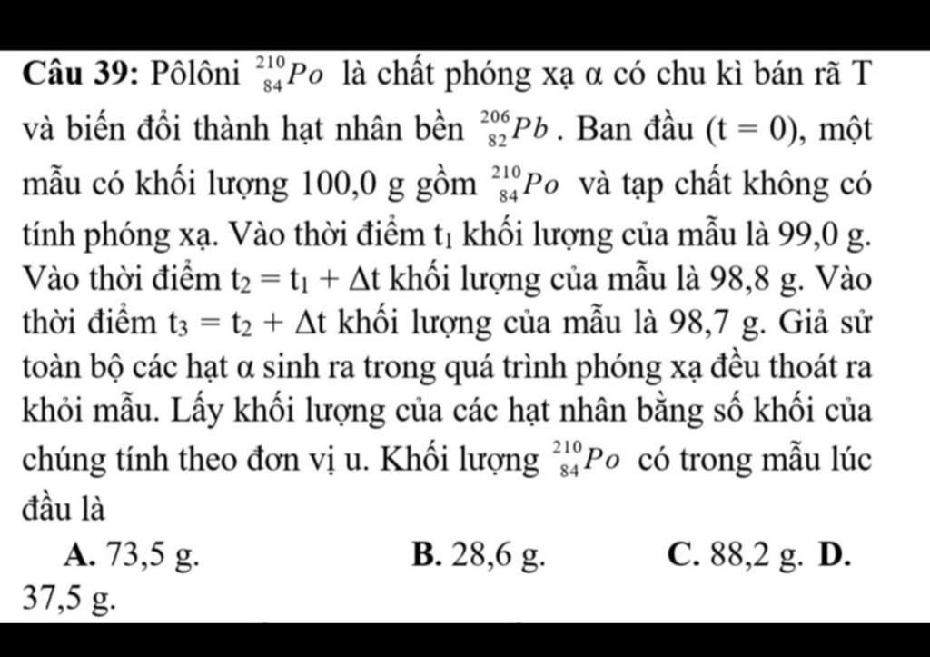 Câu 39: Pôlôni Po là chất phóng xạ a có chu kì bán rã T