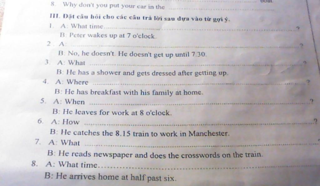 5) What time does he leave for work? ( đổi đề when -> what time )