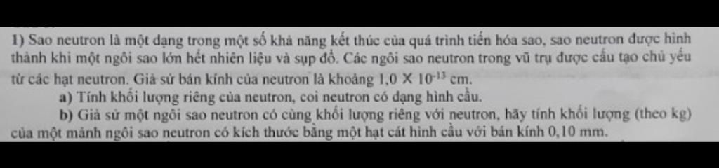 $m_{\text{mảnh sao neutron}}=DV=3,96.10^{17}.\dfrac{4}{3}\pi.(10^{-4})^3=1,66.10^6 kg$