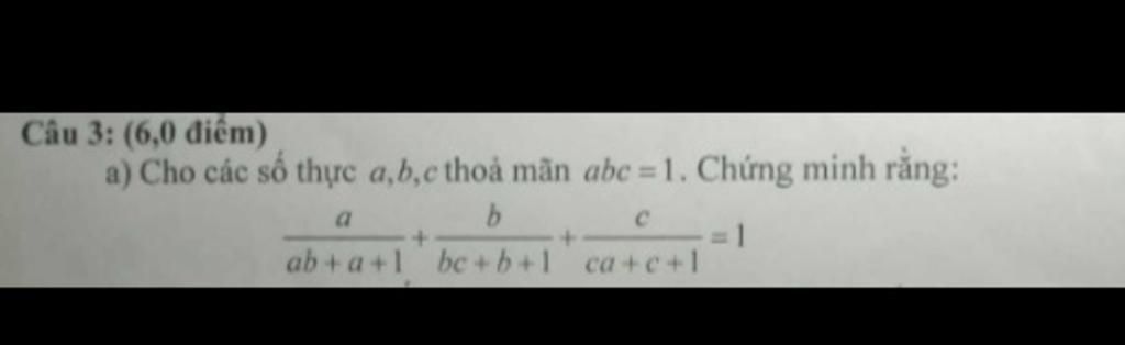 Vậy `a/(ab+a+1)+b/(bc+b+1)+c/(ca+c+1)=1` với `abc=1`