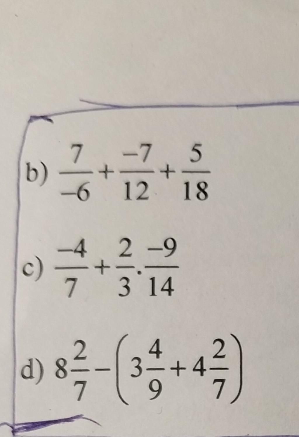 b)$\frac{7}{-6}$ + $\frac{7}{12}$ + $\frac{5}{18}$
