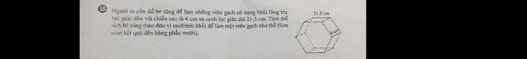 lục giác đều với chiều cao là 4 con và cạnh lục giác dài 21,5 cm. Tính thể