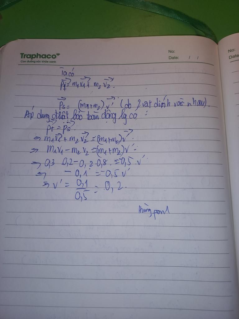 \Rightarrow 0,3.0,2 + 0,2\left( { - 0,8} \right) = 0,5.v\\