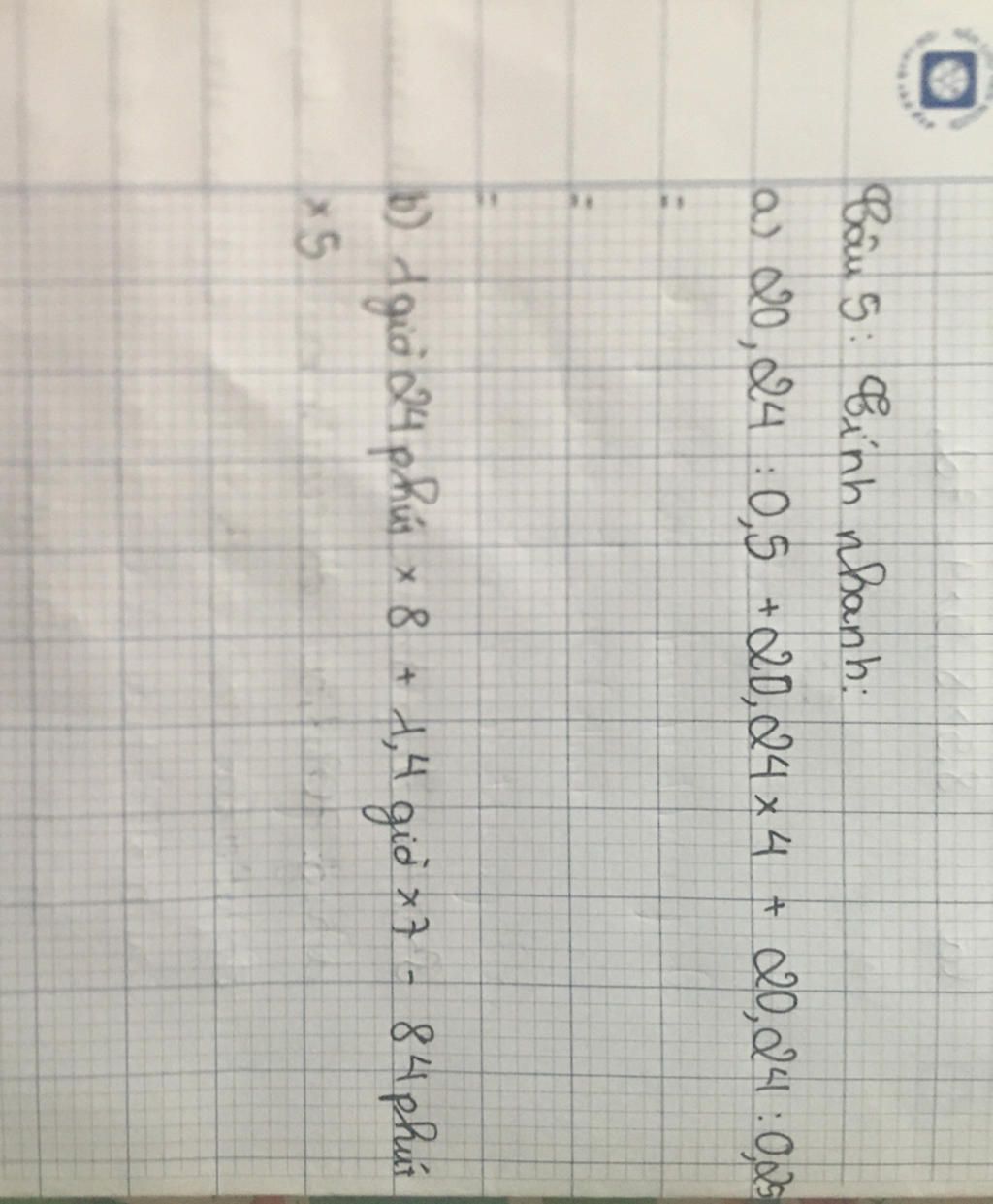 Do đó `:` `1` giờ `24` phút `.` `8` `+` `1,4` giờ `.` `7` `-` `84` phút `.` `5`