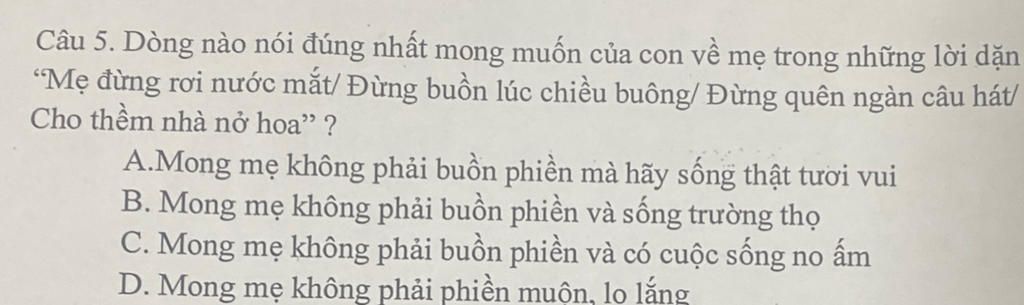 `->` Chọn đáp án: `A.` Mong mẹ không phải buồn phiền mà hãy sống thật tươi vui.