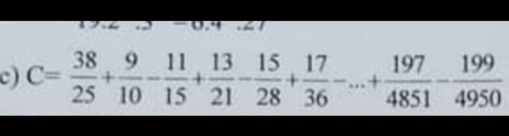`C = 38/25 + 9/10 - 11/15 + 13/21 - 15/28 + 17/36 -...+ 197/4851 - 199/4950`