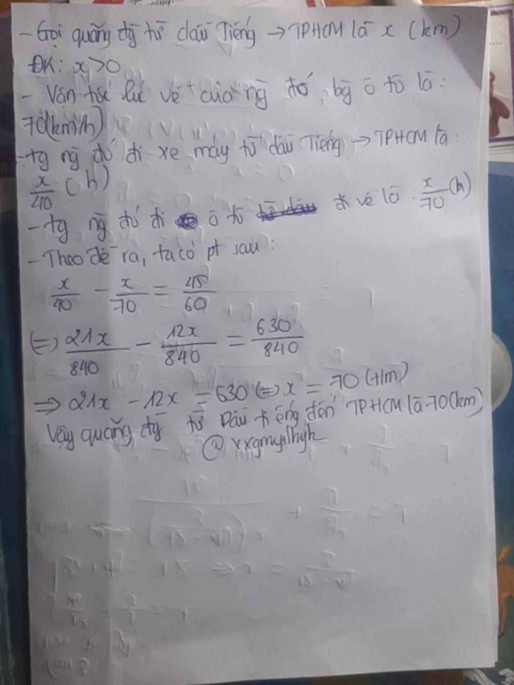 Một xe máy đi từ Dầu Tiếng đến TP. HCM với vận tốc 40km/h. Cùng tuyến đường đó lúc về người đó đi bằng ô tô với vận tốc nhanh hơn vận tốc khi đi 30km/h. Biết thời gian về bé hơn thời gian đi 45p. Tính quãng đường từ Dầu Tiếng đến TP. HCM