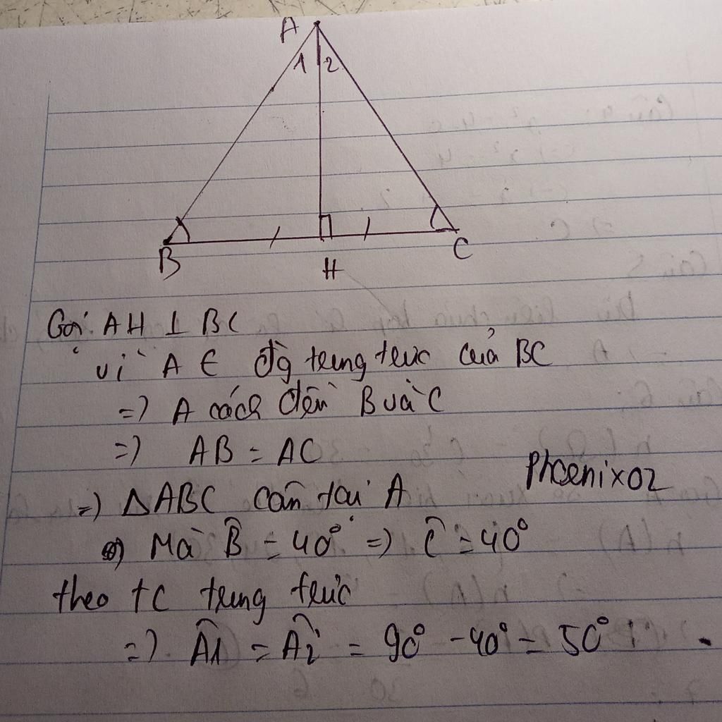 Cho tam giác ABC có A thuộc đường trung trực Bc biết góc B=40 độ.Tính số đo của các góc.
