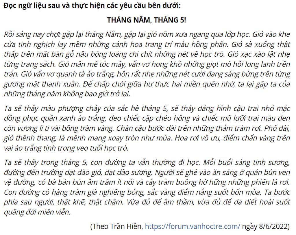 `@` Phương thức biểu đạt chính của đoạn trích là biểu cảm vì tác giả đã bộc lộ được cảm xúc , nổi lòng của tác giả , làm cho độc giả cảm thấy tác giả đang mong nhớ , nghĩ về tuổi xuân , tuổi học trò vô lo , vô nghĩ, vui vẻ , gợi cho độc giả cảm giác nhớ nhung trường lớp , khung cảnh một năm học kết thúc , bao buồn vui khó quên