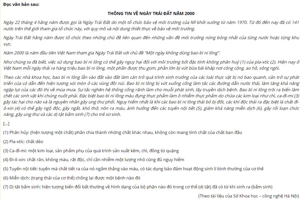 Nhận định không nói về tác hại của bao bì ni lông đối với môi trường tự nhiên: Bao bì ni lông màu đựng thực phẩm làm ô nhiễm thực phẩm do chứa các kim loại như chì, ca-đi-mi gây tác hại cho não và là nguyên nhân gây ung thư phổi.