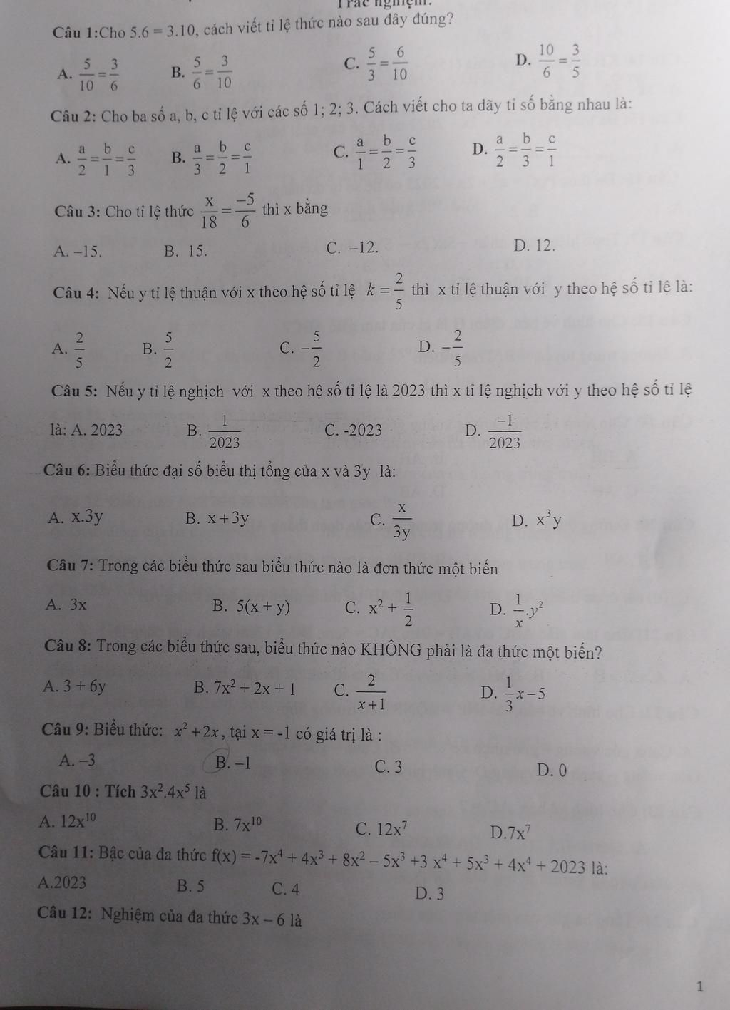 Vì $y$ tỉ lệ nghịch với $x$ theo hệ số tỉ lệ là $2023 $