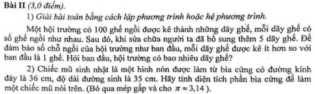 `1)` Gọi số dãy ghế ban đầu của hội trường là: `x` (dãy ghế; `x\inNN**`)
