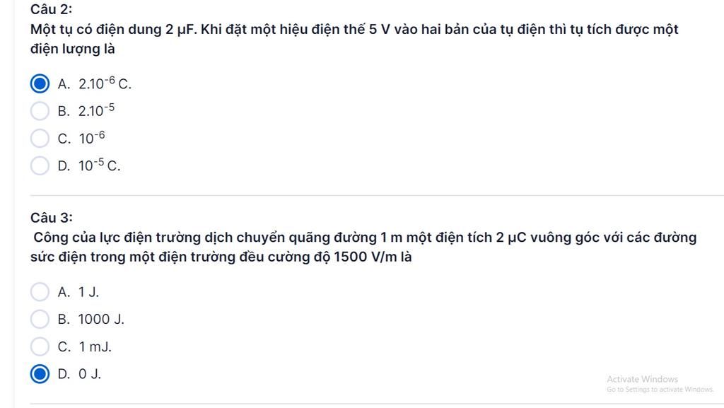 \(Q = CU = {2.10^{ - 6}}.5 = {10^{ - 5}}C\)