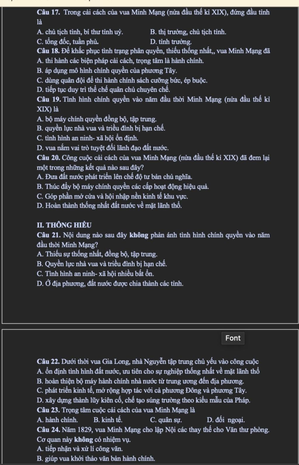 Câu 21. Nội dung nào sau đây không phản ánh tình hình chính quyền vào năm đầu thời Minh Mạng?