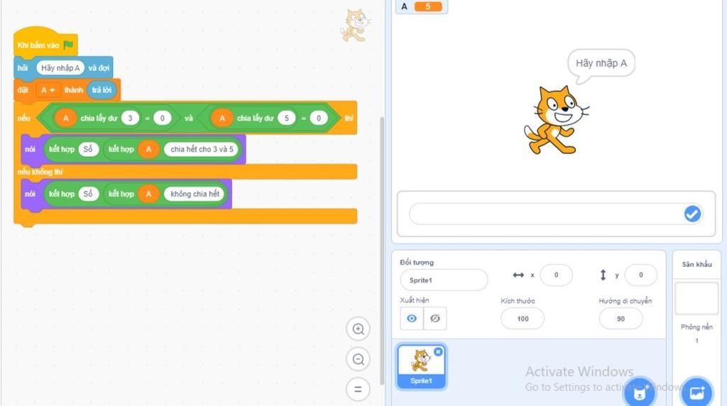 1. Sử dụng phần mềm scratch viết chương trình nhập vào số nguyên a, kiểm tra số đó có chia hết cho 3 và 5 không?