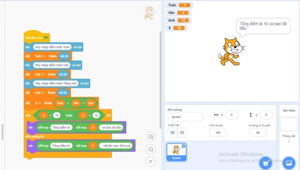 Các anh chị lớp 9 thi vào lớp 10, các em hãy viết chương trình để kiểm tra xem các anh chị có đậu không. Biết rằng tổng điểm = Toán + Văn + Anh . Nếu tổng điểm >=18 thì đậu còn lại thì rớt. Với điểm toán, văn, anh được nhập từ bàn phím