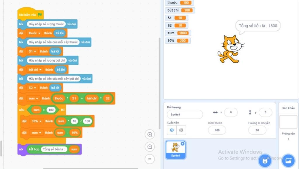 1. Một học sinh đi nhà sách mua dụng cụ học tập gồm thước và bút chì các em hãy dùng scratch để viết chương trình tính tiền giúp biết rằng tổng tiền= số lượng*giá tiền thước+ số lượng * giá tiền bút. Nếu tổng số tiền lớn hơn 100 thì được giảm giá 10%. In ra màn hình tiền phải trả. Với số lượng được nhập từ bàn phím.